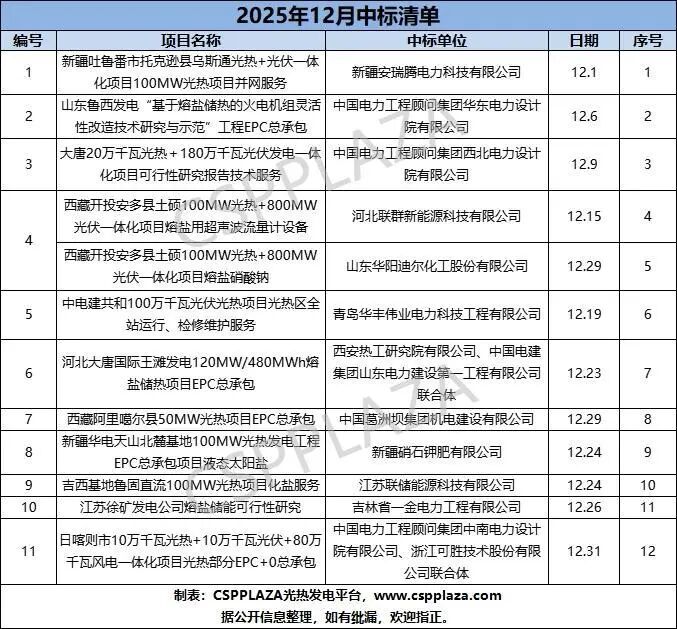 According to incomplete statistics from CSPPLAZA, a total of 12 important tenders across 11 CSP/molten salt thermal storage-related projects were completed in December 2025.