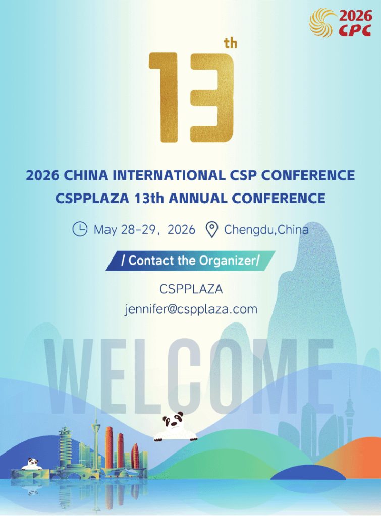 The Chinese market extends a warm welcome to the joint participation of peers in the global concentrating solar power generation industry. On May 28-29,2026, the 13th China International CSP Conference&CSPPLAZA Annual Conference, co-hosted by China solar thermal power authority media business platform CSPPLAZA and leading enterprise in solar thermal power industry Cosin Solar Technology Co.,Ltd.,and Royal Tech CSP Limited will be held in Chengdu,Sichuan province,China.